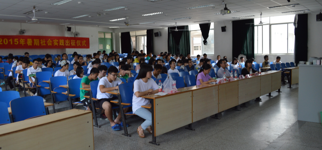 7月7日,能源与电气学院举行了2015年暑期社会实践出征仪式,国产自拍 党委副书记汤鸣鸿、院团委书记孙瀚、13级本科生辅导员杨丹老师、14年级本科生辅导员雷镕甄老师、15级本科生辅导员王颖老师以及52支实践团队主要成员共同出席了此次出征仪式。