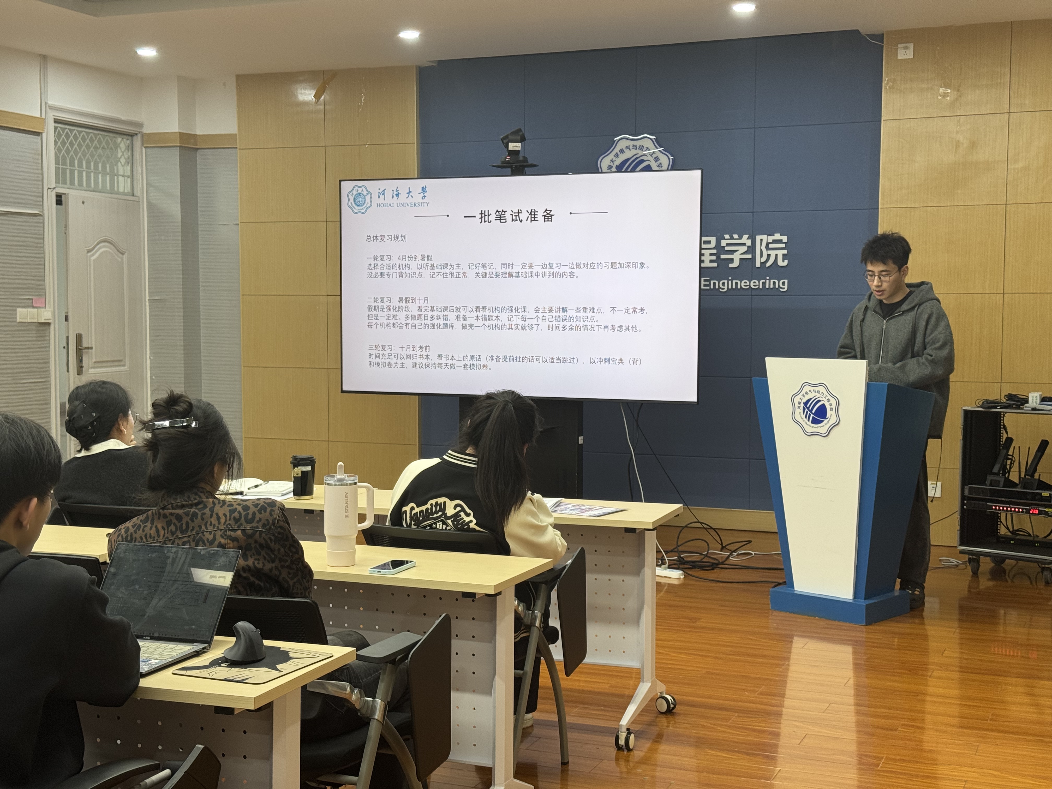 高靖宇围绕备考国网经验,从提前批与统考一批的时间分配入手,梳理了一批笔试的三轮复习规划、各科目复习顺序与备考重难点,对面试中无领导小组讨论、半结构化的应对要点进行了个人经验分享。