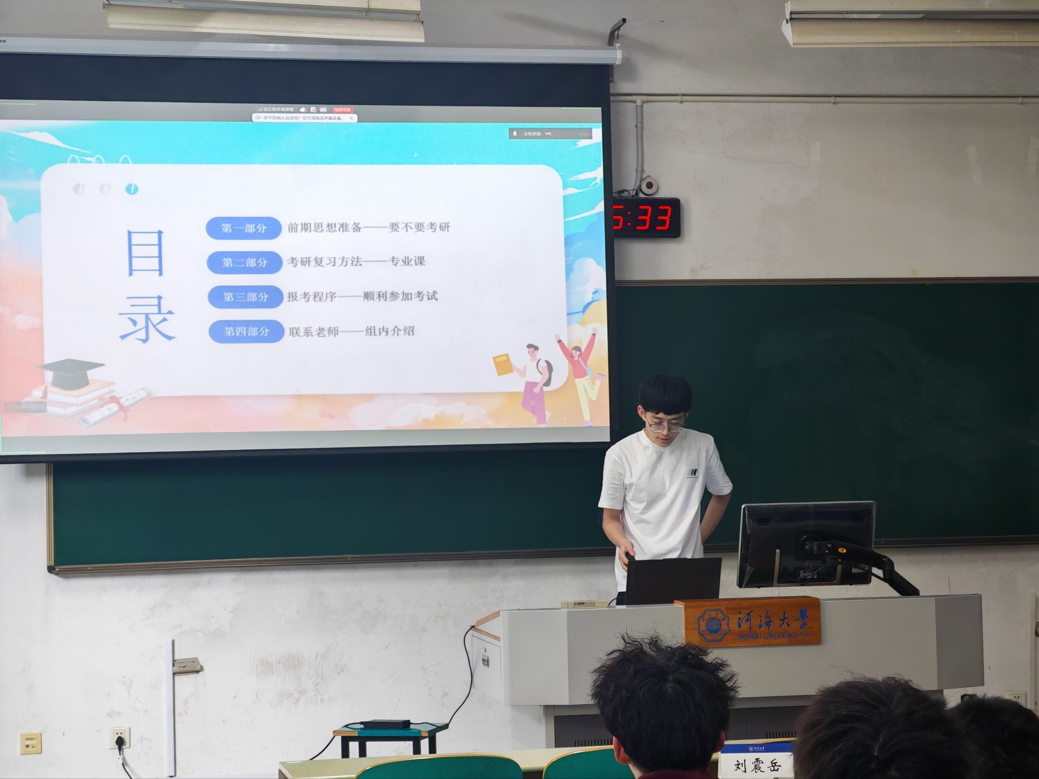 刘震岳同学则聚焦考研专业课与报考程序,带来极具实操性的建议。他提醒同学们“先确定院校,为目标努力”,避免盲目报考,同时关注官网动态以防专业课改考。在专业课备考上,他主张分阶段推进:前期梳理框架、暑期强化做题、秋季真题训练、考前全真模拟。他还详细介绍了报考程序中的关键节点,如预报名、正式报名、线上确认、准考证打印等,并鼓励有意报考国产自拍 的同学提前联系导师,做到“少鸽子、讲诚信”。